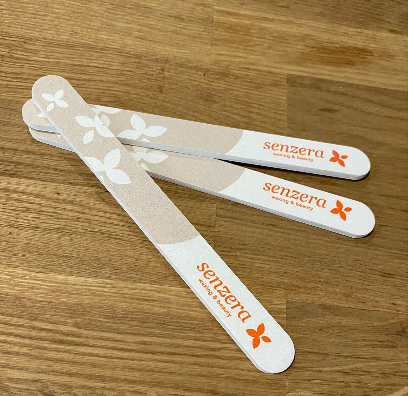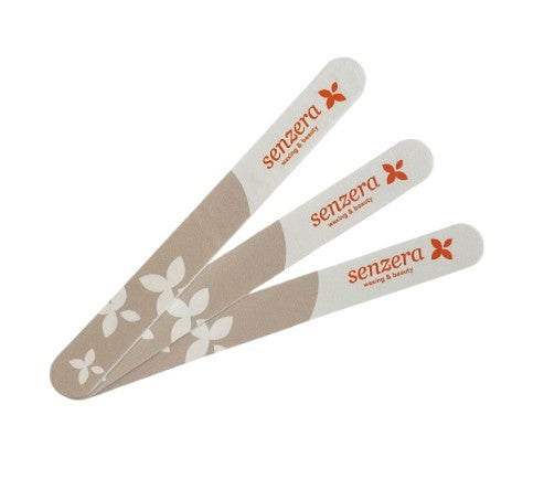 Unsere Senzera Profinagelfeile ist gerade geschnitten und an den Ecken abgerundet mit einer Größe von 180 x 18,5 mm. Sie besitzt eine Körnung von 180/240. Das Set beinhaltet 3 Nagelfeilen.